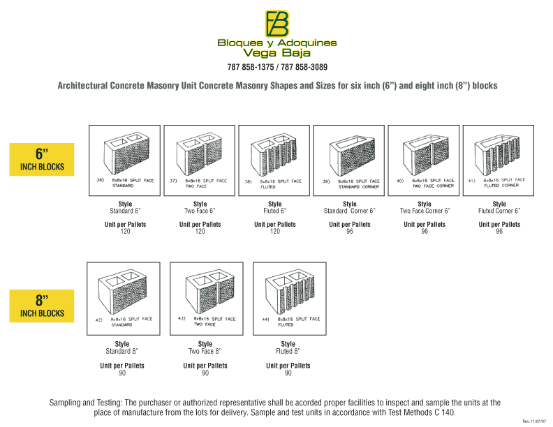 Architectural Blocks Architectural Concrete Masonry Unit Concrete Masonry Shapes and Sizes for six inch (6”) and eight inch (8”) blocks